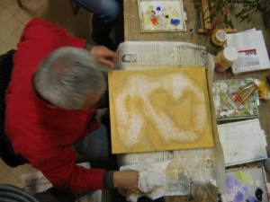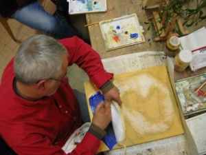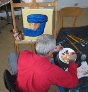 passion, la magie... (le chapeau haut de forme) Sont r�unis ici pas mal de difficult�s, (plis de tissus, perspectives, effets de mati�res, sable etc...) et Jean Pierre s'en sort bien, aid� d'une d�termination d'acier tremp�, et d'une humeur joviale qui fait si grand bien � notre s�ance du jeudi soir ! Vraiment bien pour quelqu'un dont c'est ici ses premiers pas en peinture, n'est ce pas ?