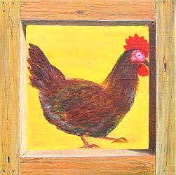Mon triptyque poules, 2005 : Deux carrés 30 x 30 cm et un carré 60 x 60 cm. Effet de cadre en bois en trompe-l'œuil. |
