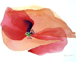 Je répands sur mes toiles des flaques de peinture plus ou moins diluée, les fait glisser en tous sens, très doucement, afin d'obtenir une allure de pétale. Le soleil m'est un allié, évaporant rapidement ces lagunes de liquides rouges. Je répète ces opérations jusqu'a ce que l'idée de la fleur me semble posée.