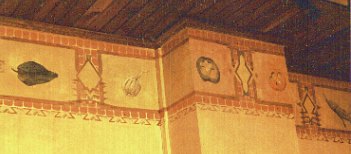 Pierre Marcel and accomplice Frederic Lere like to compose these repetitive motifs along ceilings. Here, a composition directly dished out this Mexican menu, with the advises of the Chef. New-Mexico vegetables, pepper, garlic, tomatoes, corn, etc...hand painted, on a background of faux finish and ceramic trompe l'oeil. About 24" wide, 200 ft long!.